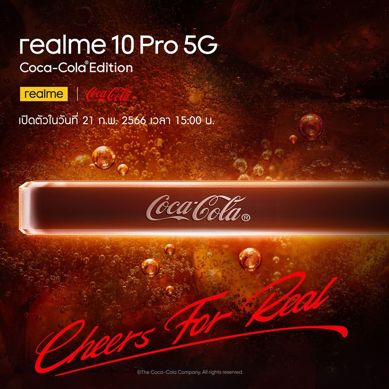 realme (เรียลมี) แบรนด์สมาร์ตโฟนเพื่อคนรุ่นใหม่ที่เติบโตเร็วที่สุดในโลก มุ่งหน้าพัฒนาผลิตภัณฑ์ที่มาพร้อมกับเทคโนโลยีและดีไซน์อันแปลกใหม่อย่างคาดไม่ถึง เพื่อตอกย้ำความเป็นผู้นำทั้งในด้านดีไซน์และเทคโนโลยีต่าง ๆ ทั้งนี้ในตลอดระยะเวลาที่ผ่านมา realme ได้รับกระแสตอบรับที่ดีอย่างไม่ขาดสาย และจากผลจากการสำรวจจาก Canalys ในไตรมาสที่ 4 ในปี 2022 ที่ผ่านมา realme ยังคงประสบความสำเร็จอย่างต่อเนื่อง ด้วยการก้าวขึ้นสู่อันดับ 4 แบรนด์สมาร์ตโฟนในภูมิภาคเอเชียตะวันออกเฉียงใต้ และในวันนี้ realme ได้กลับมาเรียกเสียงฮือฮาอีกครั้งกับการเตรียมเปิดตัวสมาร์ตโฟนลิมิเต็ดเอดิชัน “realme 10 Pro 5G Coca-Cola® Edition” ผลงานคอลแลบระดับโลกร่วมกับแบรนด์เครื่องดื่มยักษ์ใหญ่ Coca-Cola® สร้างสรรค์สุดยอดสมาร์ตโฟนในดีไซน์สุดลิมิเต็ดจำนวนจำกัด พร้อมประกาศเปิดตัวอย่างเป็นทางการในวันที่ 21 กุมภาพันธ์นี้