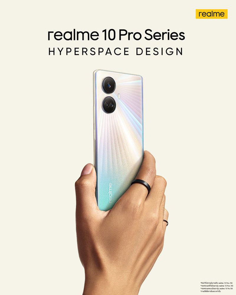 realme (เรียลมี) แบรนด์เทคโนโลยีเพื่อคนรุ่นใหม่ที่เติบโตเร็วที่สุดในโลก เตรียมสร้างปรากฏการณ์ให้กับวงการสมาร์ตโฟนโลกอีกครั้ง กับ realme 10 Pro Series ชูไฮไลต์ดีไซน์แห่งโลกอนาคตแบบ “ไฮเปอร์​สเปซ” (Hyperspace) ที่ได้แรงบันดาลใจจากแนวคิดอุโมงค์ไฮเปอร์สเปซที่อลังการด้วยเส้นแสง 3 มิติกับเอ็ฟเฟ็กต์สุดตระการตาทั้ง Prism Acceleration Pattern และ Nebula Particles สื่อถึงประสิทธิภาพที่เร็วแรงระดับซูเปอร์อัลตร้าที่มากับสมาร์ตโฟนรุ่นนี้ พร้อมจอ Refresh Rate สูง 120Hz ตอบโจทย์ทุกการใช้งานด้วยอนิเมชันที่ไหลลื่นเนียนตาขั้นสุด ผสานเทคโนโลยีการปรับความสว่างหน้าจอสุดล้ำถึงระดับ 2160Hz PWM ซึ่งมีประสิทธิภาพและเป็นมิตรต่อดวงตาสูงสุดของโลกสมาร์ตโฟนปัจจุบัน ช่วยให้แสดงสีสันได้อย่างเที่ยงตรงและคมชัดในทุกระดับความสว่าง และที่ขาดไม่ได้คือการอัปเกรดเทคโนโลยีกล้องถ่ายภาพด้วยการออกแบบเลนส์กล้องหลักแบบ Twin-lens Reflex (TLR) เพื่อยกระดับการถ่ายภาพ โดยเฉพาะการเก็บภาพแนวสตรีตหรือแนวอาร์ตเก๋ ๆ ที่หนุ่มสาวยุคใหม่ต้องการจากกล้องถ่ายภาพในวันนี้ รวมถึงฟีเจอร์เด็ดอีกมากมายที่จะมอบประสบการณ์ระดับเรือธงได้อย่างสมบูรณ์แบบ และแน่นอน ด้วยระดับราคาที่เข้าถึงง่ายกว่าแฟล็กชิปทั่วไป เพื่อมอบความความคุ้มค่าแก่ผู้ใช้สูงสุดตามสไตล์ realme