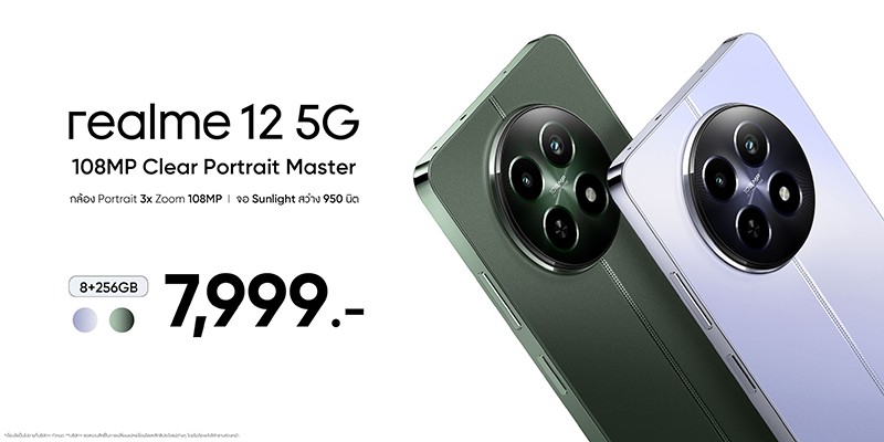 “realme 12 5G” ชูจุดเด่นกล้อง Portrait ซูม 3 เท่ารุ่นแรกในเซกเมนต์บนความละเอียด 108 ล้านพิกเซล พร้อมกับดีไซน์ขอบตัวเครื่องสุดหรูหราที่มีแรงบันดาลใจจากนาฬิกาสวิส โดดเด่นด้วยหน้าปัด Sunburst และฝาหลังลายตะเข็บ 3D Jubilee Bracelet และขอบ PVD ขัดเงา ภายใต้บอดี้ที่เพรียวบางเพียง 7.69 มม. พร้อมฟีเจอร์สุดล้ำมากมายทั้ง Dynamic Button รุ่นแรกในเซกเมนต์เพื่อการปรับแต่งและเรียกใช้คำสั่งต่าง ๆได้อย่างรวดเร็ว นำเสนอในสเปกความจุเดียว 8/256GB ในโทนสี Twilight Purple และ Woodland Green เปิดราคาจำหน่ายในไทยเพียง 7,999 บาท ตามช่องทางจำหน่ายต่าง ๆ ได้แก่