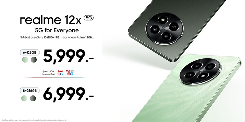 “realme 12X 5G” มอบประสบการณ์ 5G ที่ดีที่สุดในเซกเมนต์ เพื่อให้ผู้ใช้มือถือรุ่นเริ่มต้นสามารถเข้าถึงประสบการณ์อินเตอร์เน็ตความเร็วสูงได้ง่ายขึ้น ด้วยเสารับสัญญาณ 5G รอบตัวเครื่องมากถึง 6 เสา ผสานอัลกอริธึมเพิ่มประสิทธิภาพเครือข่าย พร้อมโหมดการทำงาน AI Boost เอกสิทธิ์ของ realme ทำให้คุณเล่นเกมและทำงานกับแอปต่าง ๆ ได้อย่างราบรื่น พร้อมหน่วยความจำที่ใหญ่ที่สุดในเซกเมนต์ นำเสนอในโทนสี Feather Green และ Glowing Black ในความจุเริ่มต้น 6/128GB เปิดราคาเริ่มต้นเพียง 5,999 บาท เปิดจำหน่ายตามช่องทางต่าง ๆ ได้แก่
