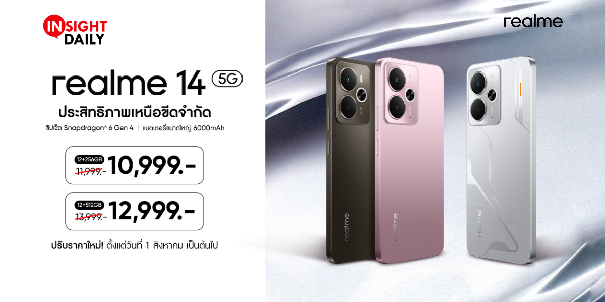 - realme 14 5G (รุ่น 12GB + 256GB) จากราคาเดิม 11,999 บาท เหลือเพียง 10,999 บาท