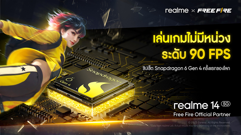 realme 14 5G series ยังได้รับเลือกเป็นพันธมิตรอย่างเป็นทางการกับเกมชั้นนำระดับโลกอย่าง Freefire โดยถูกออกแบบมาเพื่อตอบสนองความต้องการเฉพาะด้านของบรรดานักกีฬาอีสปอร์ตระดับมืออาชีพ โดยเป็นสมาร์ตโฟนที่ปรับเฟรมเรตได้สูงสุดถึง 90Hz สำหรับเกม Free Fire เพิ่มความได้เปรียบในการแข่งขัน ด้วยภาพที่ไหลลื่นสวยงามไร้ความหน่วง รวมถึงการตอบสนองต่อการสัมผัสหน้าจอที่รวดเร็วแม่นยำ และการทำงานที่เสถียรต่อเนื่อง