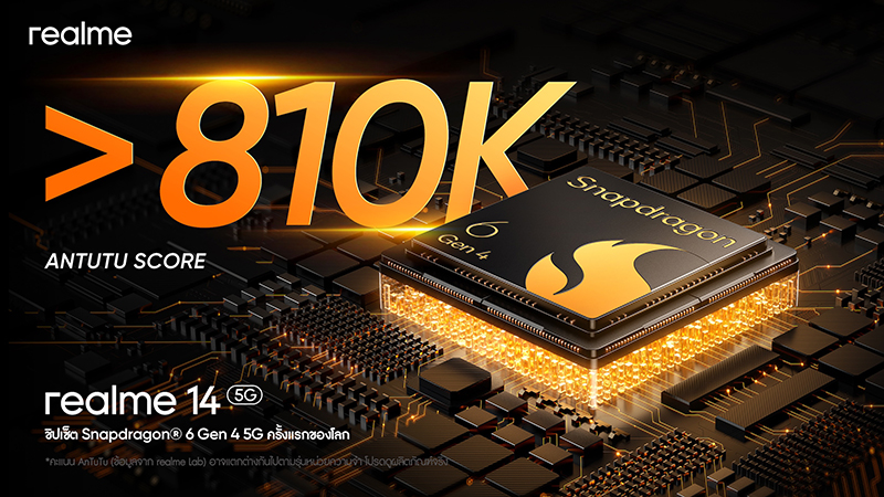 realme 14 5G ชูความโดดเด่นด้วยการเป็นสมาร์ตโฟนรุ่นแรกของโลกที่ติดตั้งชิปประมวลผลระดับเรือธงแห่งปีอย่าง Snapdragon 6 Gen 4 ที่มีคะแนน AnTuTu สูงถึง 810,000 และผลิตบนโครงสร้างระดับ 4nm ที่ประหยัดพลังงานขั้นสุด พร้อมให้แบตเตอรี่ความจุมากถึง 6,000mAh พร้อมระบบชาร์จไว 45W เพื่อมอบประสบการณ์การเล่นเกมที่ไหลลื่นและยาวนานขึ้นอย่างชัดเจน