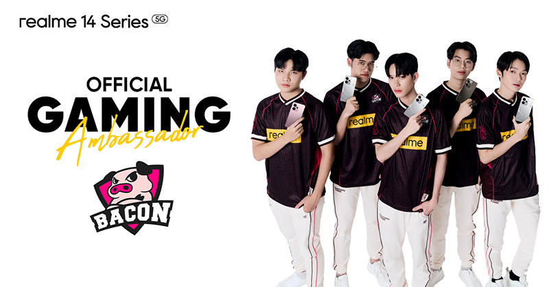 realme เล็งเห็นถึงศักยภาพของ Bacon Time ของการเป็นหนึ่งใน Soft Power ที่แข็งแกร่งในหมู่เยาวชนรุ่นใหม่ จึงจับมือกับทีมอีสปอร์ตชื่อดังเพื่อแต่งตั้งเป็น realme Official Gaming Ambassador อย่างเป็นทางการ เพื่อให้ Bacon Time เป็นตัวแทนเกมเมอรุ่นใหม่ที่สอดรับกับกลยุทธ์ล่าสุดในปี 2568 ของ realme ในการเดินหน้าสู่การเป็นเกมมิ่งสมาร์ตโฟนและตอกย้ำว่า realme 14 Series 5G เป็นสมาร์ตโฟนที่เกมเมอร์เลือกใช้อย่างแท้จริง