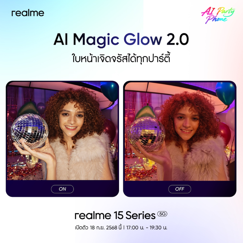 realme (เรียลมี) แบรนด์สมาร์ตโฟนเพื่อคนรุ่นใหม่ที่เติบโตเร็วที่สุดในโลก เตรียมสร้างปรากฏการณ์ความสนุกครั้งยิ่งใหญ่ในงานเปิดตัว “realme 15 Series 5G” สมาร์ตโฟนรุ่นล่าสุดจากตระกูล Number Series ที่มาพร้อม กล้อง Ultra-Clear Triple 50MP ยกระดับการถ่ายภาพคมชัดทุกรายละเอียด พร้อมอัดแน่นด้วยฟีเจอร์เด่นอย่าง AI Party Mode เติมเต็มไลฟ์สไตล์ทั้งสายถ่ายภาพ สายคอนเทนต์ และสายปาร์ตี้ตัวจริง งานนี้ยังได้ศิลปินสาวสุดฮอต GALCHANIE – “แกลชานี” ธนัญญา อินวงษ์ มาร่วมเป็นแขกรับเชิญพิเศษในบทบาท “realme Party Friend” ส่งต่อพลังบวกแห่งความสนุก แชร์มุมมองการใช้ชีวิตสไตล์ปาร์ตี้เกิร์ล และชวนแฟน ๆ สัมผัสประสบการณ์เอ็กซ์คลูซีฟไปด้วยกัน