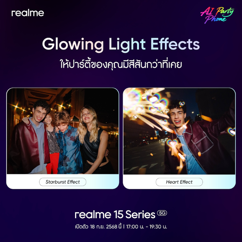 สายปาร์ตี้ต้องว้าว! realme 15 Series 5G ชูกล้อง Triple 50MP และ AI Party Mode เก็บทุกช็อตความสนุก