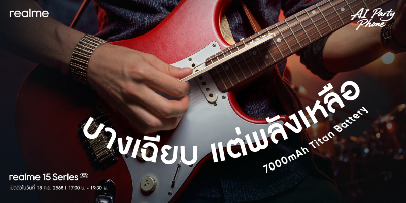 เตรียมสัมผัส “AI Party Phone” รุ่นแรกของอุตสาหกรรม ที่ทำให้ทุกปาร์ตี้สนุกสนาน สดใสแต่เปี่ยมไปด้วยความทรงพลัง ในงานเปิดตัววันที่ 18 กันยายน 2568 นี้ โดยจะถ่ายทอดสดผ่าน Facebook, YouTube และ TikTok ของ realme Thailand ตั้งแต่เวลา 17.00 น. เป็นต้นไป พร้อมกิจกรรมร่วมสนุกชิงของรางวัลมากมายให้ร่วมลุ้น เพื่อให้แฟน ๆ realme สัมผัสกับไลฟ์สไตล์ที่คุณ “ใช้ชีวิตให้เรียลทุกช็อต” อย่างแท้จริง!