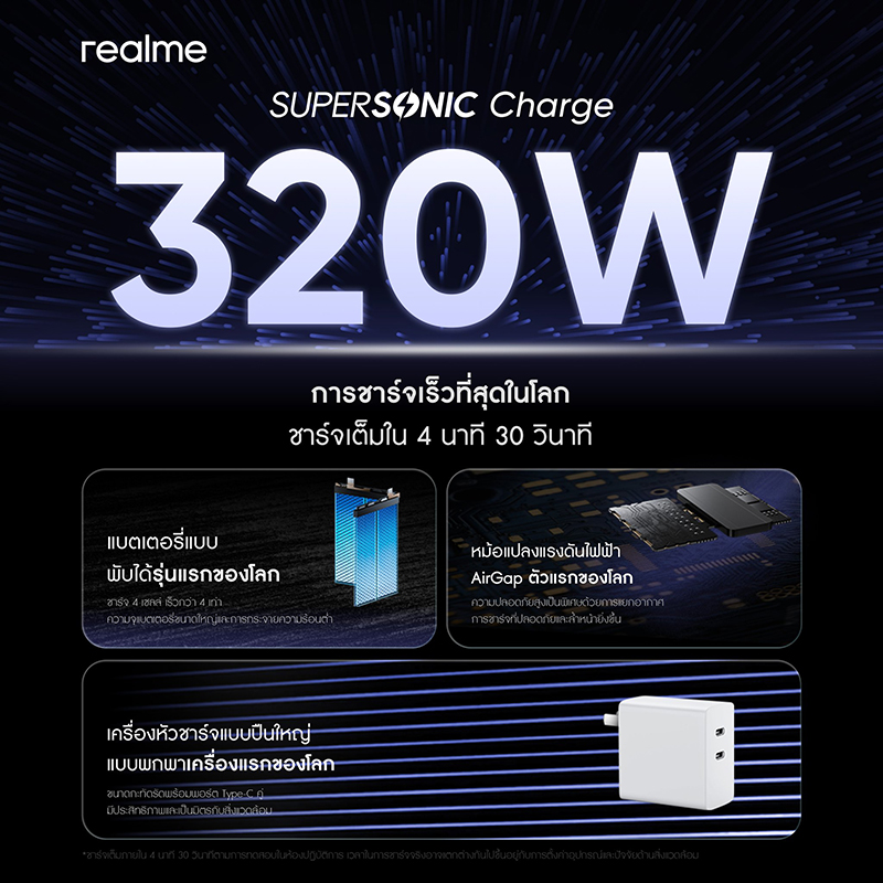 realme เปิดตัวนวัตกรรมชาร์จเร็วที่สุดในโลก “320W Supersonic Charge”ชาร์จแค่ 4 นาที แบตเต็ม 100%