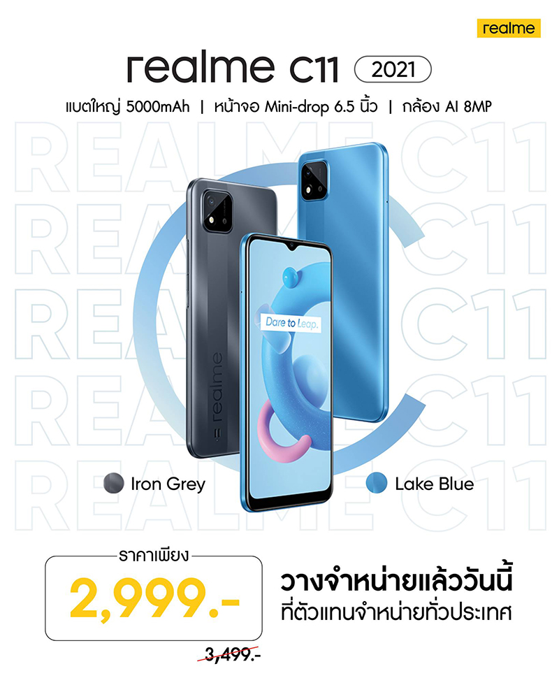 อย่ารอช้า! รีบเป็นเจ้าของสมาร์ทโฟนสุดคุ้ม realme C11 (2021) ในราคาเพียง 2,999 บาท มีให้เลือกทั้งหมด 2 สีระหว่าง Lake Blue และ Iron Grey พร้อมวางจำหน่ายแล้วตั้งแต่วันนี้ที่ตัวแทนจำหน่ายทั่วประเทศ