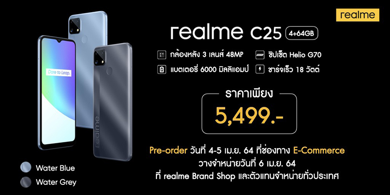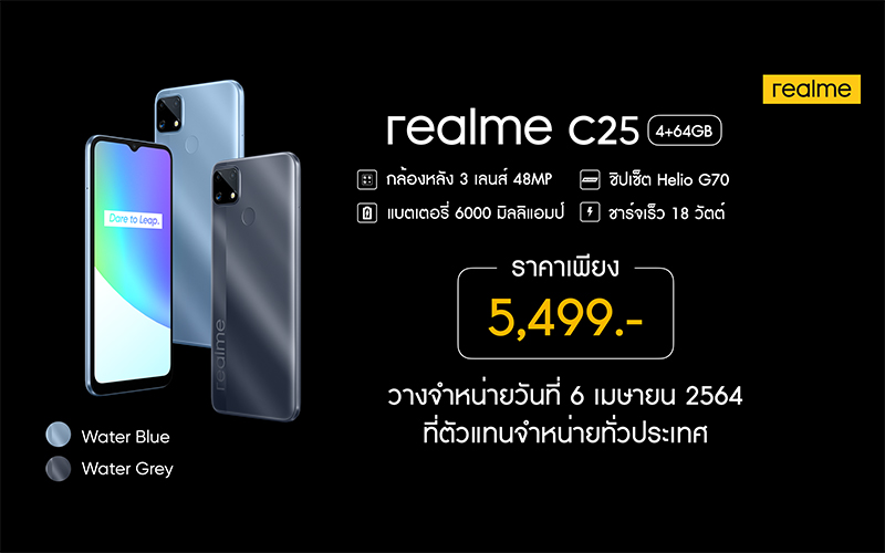 realme C25 “กล้อง 48MP แบต 6,000 mAh” ความจุ 4GB + 64GB มาพร้อมกับกล้องหลัง 3 เลนส์ ความละเอียด 48 ล้านพิกเซล ชิปเซ็ตเกมมิ่ง Helio G70 แบตเตอรี่ 6000 มิลลิแอมป์ พร้อมชาร์จเร็ว 18 วัตถ์ มาในราคาเพียง 5,499 บาท วางจำหน่ายในวันที่ 6 เมษายน ที่ realme Brand Shop และตัวแทนจำหน่ายทั่วประเทศ