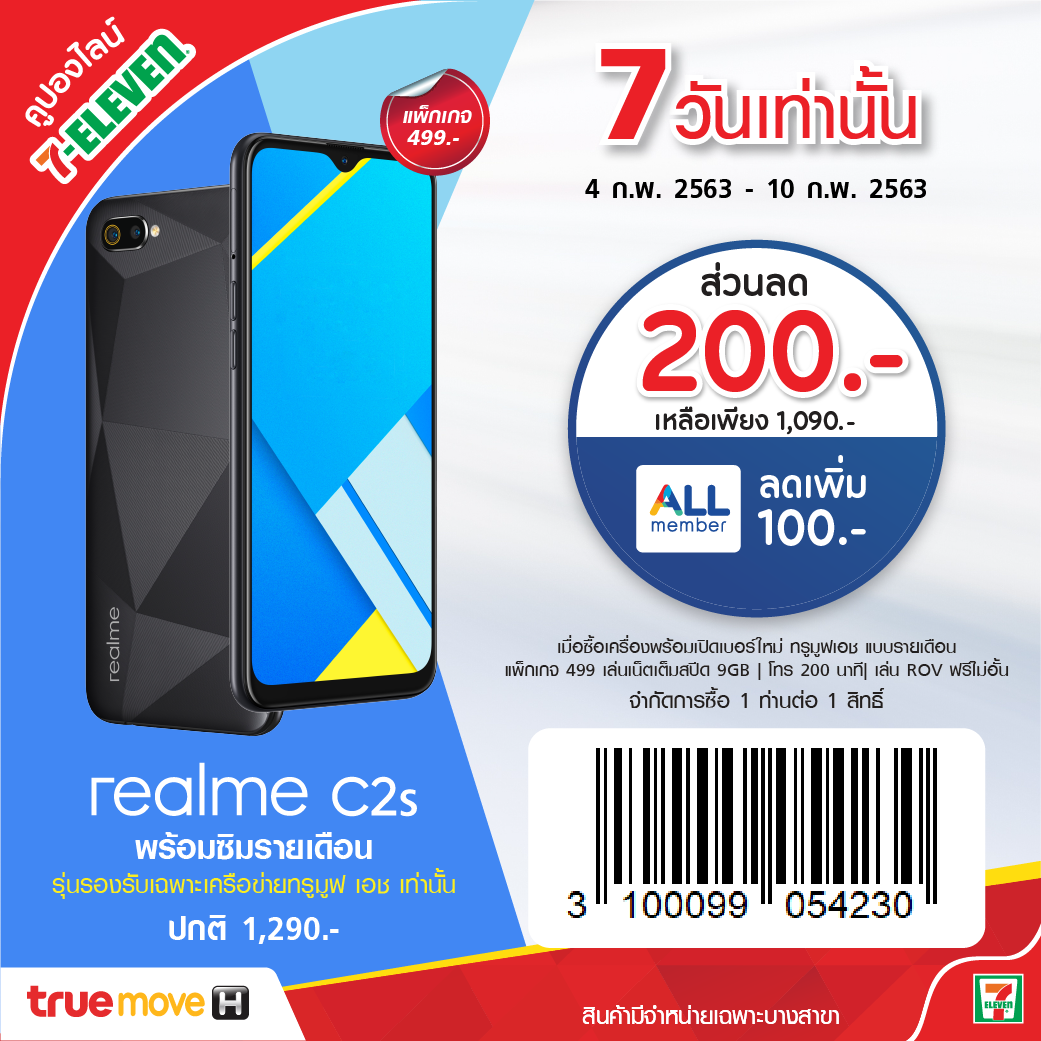 หลังจากวางจำหน่าย realme C2s ผ่าน 7-Eleven ไปเมื่อต้นปี ล่าสุดเพื่อเป็นเการตอบแทนกระแสตอบรับที่ดีเยี่ยม ทาง realme และ 7-Eleven จัดส่วนลดเพิ่มจากราคาปกติ 1,290 บาท แถมฟรีหูฟัง เมื่อซื้อพร้อมซิม ทรูมูฟ เอช แบบรายเดือน แพ็คเกจ 4G+ Extra FUN Unlimited 499 โดยจะลดเพิ่มจากราคาปกติอีก 200 บาท เหลือเพียง 1,090 บาท และพิเศษสุดๆ สำหรับลูกค้าที่เป็นสมาชิก All Member ลด On-top เพิ่มอีก 100 บาท เหลือเพียง 990 บาท
