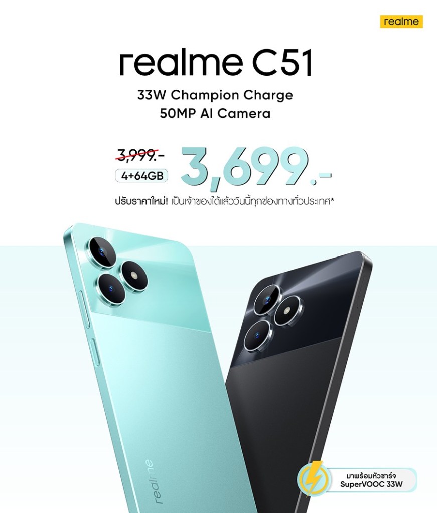 realme (เรียลมี) แบรนด์สมาร์ตโฟนเพื่อคนรุ่นใหม่ที่เติบโตเร็วที่สุดในโลก เอาใจสายบัดเจ็ตโฟน ปรับราคา “realme C51” เหลือเพียง 3,699 บาท จากปกติ 3,999 บาท ให้คุณเป็นเจ้าของสมาร์ตโฟนระดับแชมป์เปี้ยนอย่างคุ้มค่ายิ่งขึ้น เหมาะกับผู้ที่กำลังมองหามือถือราคาประหยัดสำหรับใช้งานทั่วไป แต่ยังคงได้ประสิทธิภาพใกล้เคียงกับรุ่นเรือธงด้วยกลยุทธ์การอัปเกรด 4 ฟีเจอร์หลักภายใต้ปรัชญา “No leap, no launch” ไม่ว่าจะเป็นกล้องถ่ายภาพความละเอียดสูง ระบบชาร์จไว ดีไซน์สุดพรีเมียม และพื้นที่เก็บข้อมูลแบบจัดเต็ม พร้อมจำหน่ายแล้วตั้งแต่วันนี้ที่ realme Brand Shop ทุกสาขา ศูนย์จำหน่ายสมาร์ตโฟนชั้นนำทั่วประเทศและช่องทางอีคอมเมิร์ซทั้ง Shopee, Lazada และ Tiktok Shop