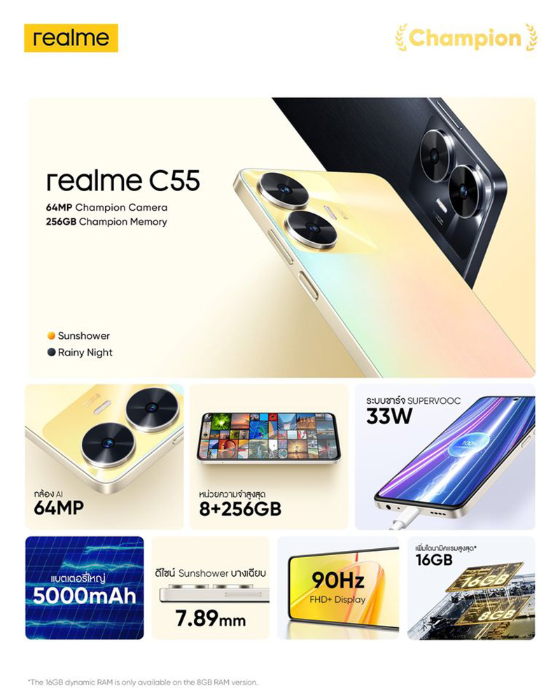 เริ่มต้นด้วยกล้องถ่ายภาพความละเอียด 64 ล้านพิกเซลเป็นรุ่นแรกของเซกเมนต์ และกล้องหน้า 8 ล้านพิกเซล และยังเป็นรุ่นแรกในตระกูล C-series ที่ใช้เซ็นเซอร์กล้องหลักขนาดใหญ่ถึง 1/2 นิ้ว ซึ่งเป็นตัวเดียวกับรุ่นแฟล็กชิปอย่าง realme GT Master Edition แถมโหมดการถ่ายภาพ ProLight Imaging Technology ที่ให้ภาพถ่ายสว่างสดใสในทุกสภาพแสง ตามมาด้วยหน่วยความจำที่มีพื้นที่เก็บข้อมูลมากถึง 256GB และยังสามารถเพิ่มการ์ดหน่วยความจำได้สูงสุดถึง 1TB ผสานกับ DRE Technology ที่สามารถเพิ่ม RAM ได้เป็น 8+8GB หรือรวมเป็น 16GB มอบประสบการณ์สมาร์ตโฟนที่ลื่นไหลได้มากที่สุด และด้วยความเข้าใจถึงไลฟ์สไตล์ยุคใหม่ realme C55 จึงใส่เทคโนโลยีระบบชาร์จเร็ว 33W SUPERVOOC แบตเตอรี่ขนาดยักษ์ 5000mAh จาก 0-100% ในเวลาเพียง 63 นาที จึงหมดกังวลเรื่องการใช้งานระหว่างวัน และไฮไลต์สำคัญที่ทำให้ realme C55 ดูหรูหรามากที่สุดในคลาสคือดีไซน์ฝาหลังที่สวยงามระดับมาสเตอร์พีซ ซึ่งได้แรงบันดาลใจจากองค์ประกอบต่าง ๆ ในธรรมชาติและมอบประกายอันระยิบระยับของอนุภาคแสงกว่า 500,000 จุด นำเสนอ 2 โทนสีที่หรูหราเกินราคาทั้ง Sunshower และ Rainy Night พร้อมการออกแบบรูปทรงตัวเครื่องที่สวยเพรียวบางที่สุดในเซกเมนต์เพียง 7.89 มม.