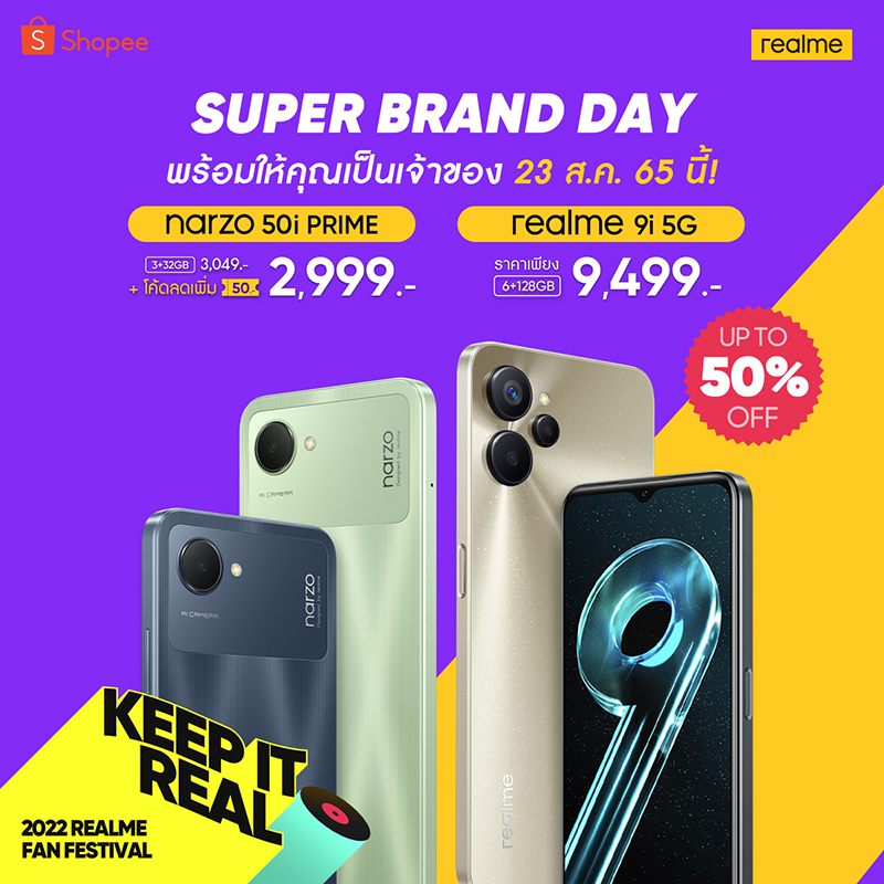 realme แบรนด์เทคโนโลยีเพื่อคนรุ่นใหม่ที่เติบโตเร็วที่สุดในโลก เตรียมสร้างปรากฏการณ์ความยิ่งใหญ่ปลายเดือนนี้พร้อมกันทั่วโลกกับงานฉลองครั้งสำคัญประจำปี “realme Fan Festival 2022” (828 Fans Festival) งานฉลองปีที่ 4 ในธีม Keep It Real ครั้งนี้ มาพร้อมกิจกรรมสนุก ๆ มากมาย และเตรียมเป็นเจ้าของสมาร์ตโฟนที่ดีที่สุดในด้านประสิทธิภาพพร้อมดีไซน์สุดมีสไตล์รุ่นใหม่ล่าสุดอย่าง realme 9i 5G และสมาร์ตโฟนสายเกมเมอร์ที่โดดเด่นด้านประสิทธิภาพในระดับเซกเมนต์เดียวกันกับ narzo 50i Prime พร้อมกันในวันที่ 23 สิงหาคมและโปรโมชั่นสุดคุ้มพิเศษในแคมเปญ Super Brand Day รับส่วนลดและของแถมอีกมากมาย รอให้คุณเป็นเจ้าของ!