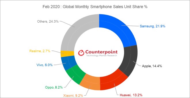 realme ครองตำแหน่งสมาร์ทโฟนอันดับ 7 ของตลาดสมาร์ทโฟนทั่วโลกอย่างต่อเนื่อง ในเดือนกุมภาพันธ์ 2563