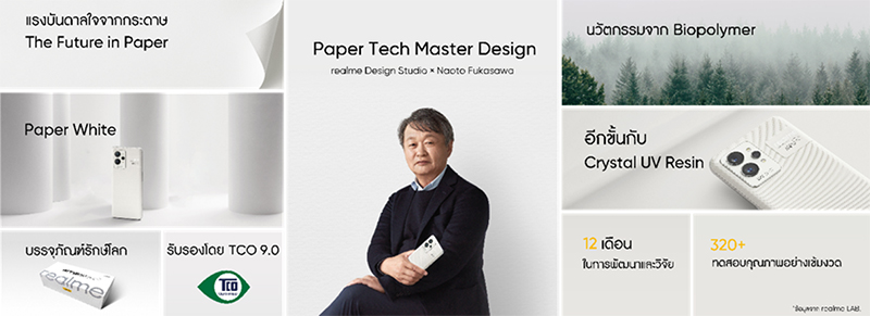 realme ได้ร่วมมือกับ นาโอโตะ ฟุคาซาวา ดีไซเนอร์ชาวญี่ปุ่นชื่อดังแห่งวงการออกแบบสินค้าอุตสาหกรรมระดับโลก มาออกแบบสมาร์ตโฟนด้วยวัสดุไบโอโพลิเมอร์ ที่ได้รับแรงบันดาลใจมาจากกระดาษ (The Future in Paper) โดยใช้เวลากว่า 12 เดือนในการพัฒนาและวิจัยผลิตภัณฑ์ต้นแบบกว่า 63 แบบ ผสานกับการแกะสลักด้วยเลเซอร์ที่แม่นยำระดับ 0.1 มิลลิเมตร ก่อเกิดเป็นงานศิลป์บนแนวคิดใหม่ในวงการไอที