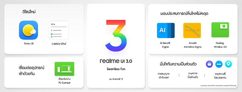realme UI 3.0 บน Android 12 มาพร้อมกับไอคอน 3D ที่ออกแบบใหม่ พร้อมด้วย Fluid Space และ Omojis ตลอดจนฟังก์ชันความเป็นส่วนตัวที่ได้รับการพัฒนาขึ้น เช่น การควบคุมการอนุญาตแอปและการซ่อนตำแหน่งต่างๆ realme UI 3.0 ยังได้รับการออกแบบโดยคำนึงถึงฟังก์ชันและการปรับแต่ง เพื่อแสดงความเป็นตัวคุณมากขึ้น และสร้างประสบการณ์ที่ไม่เหมือนใคร โดย realme มุ่งมั่นที่จะอัปเดตระบบปฏิบัตินี้เป็นเวลา 3 ปี