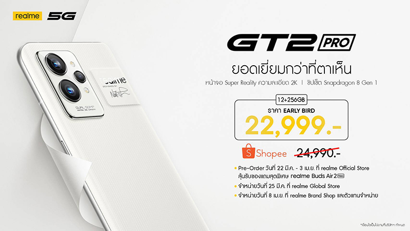 - รอบ Early bird เหลือเพียง 22,999 บาท เฉพาะช่องทาง Shopee ใน realme Official Store เปิดให้พรีออเดอร์ตั้งแต่ 22 มีนาคมถึง 3 เมษายนนี้ พร้อมรับ realme Buds Air 2 Neo จำนวนจำกัด และจำหน่ายวันแรก 4 เมษายนนี้ รวมถึงช่องทาง Shopee ใน realme Official Global store จำหน่ายวันแรกในวันที่ 25 มีนาคมนี้เป็นต้นไป >> ช้อปที่นี่เลย! : https://bit.ly/3tvjHVj