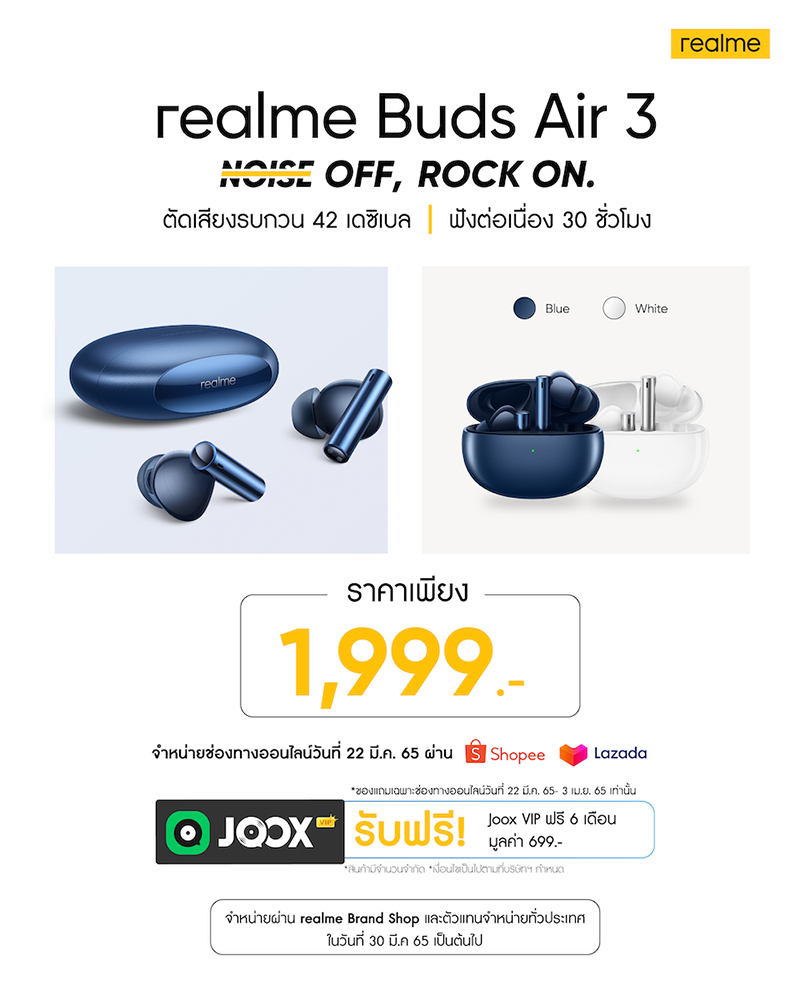 realme Buds Air 3 ราคา 1,999 บาท วางจำหน่ายวันแรก 22 มีนาคมนี้ บนช่องทางออนไลน์ที่กำหนด และวางขายพร้อมกันในทุกช่องทางในวันที่ 30 มีนาคมนี้