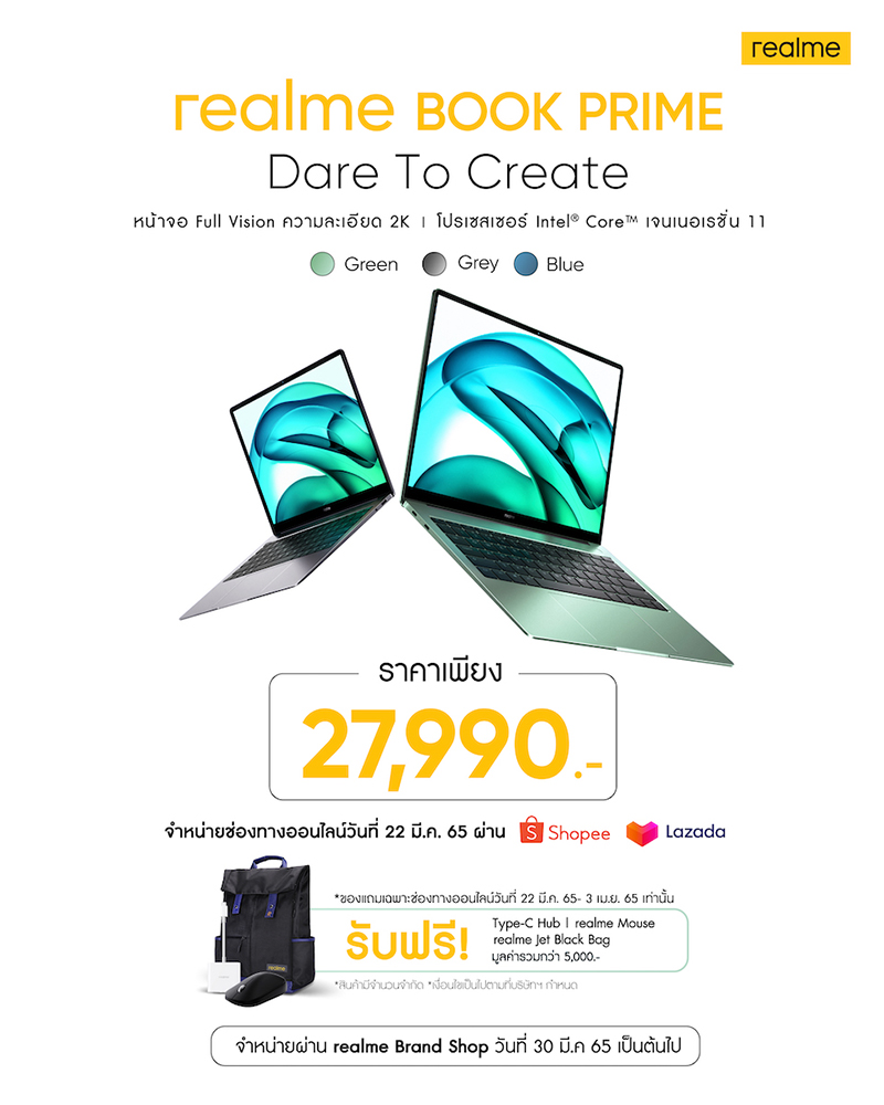 realme BOOK PRIME ราคา 27,990 บาท วางจำหน่ายวันแรก 22 มีนาคมนี้ บนช่องทางออนไลน์ที่กำหนด และจะวางขายพร้อมกันที่ realme Brand Shop ในวันที่ 30 มีนาคมนี้