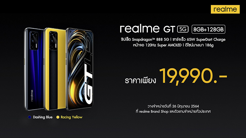 realme GT 5G สมาร์ทโฟนเรือธงแห่งปี ที่มาพร้อมชิปเซ็ต Snapdragon 888 5G เทคโนโลยีชาร์จเร็ว 65W SuperDart Charge หน้าจอ 120Hz Super AMOLED และ ดีไซน์บางเบาเพียง 186g มาในราคาเพียง 19,990 บาท วางจำหน่ายพร้อมกันทั่วประเทศในวันที่ 26 มิถุนายนนี้ ที่ realme Brand Shop และตัวแทนจำหน่ายทั่วประเทศ