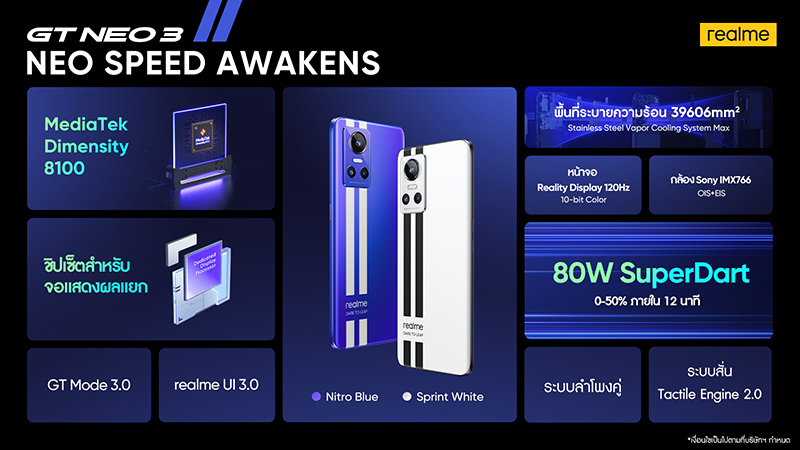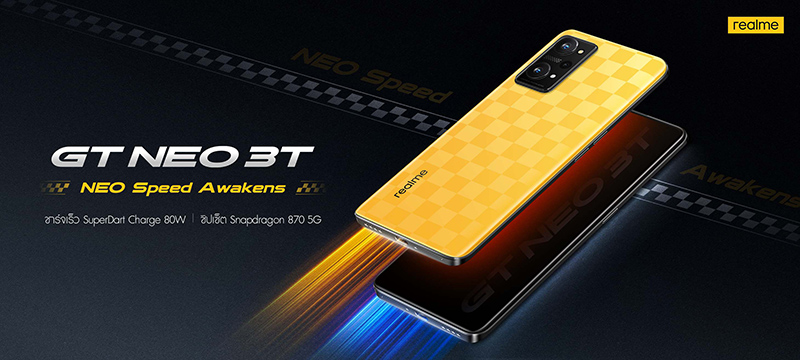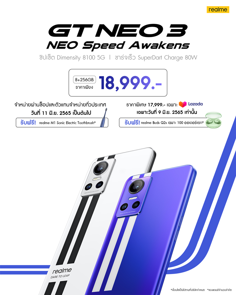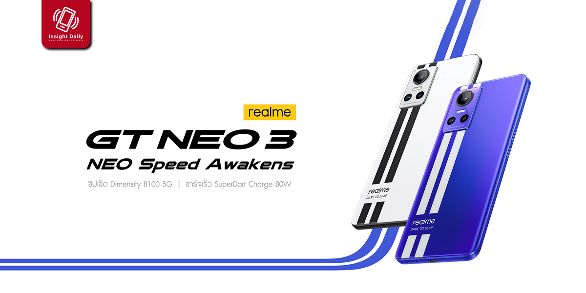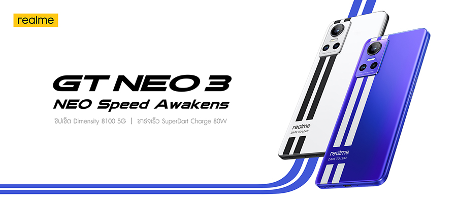 realme แบรนด์เทคโนโลยีเพื่อคนรุ่นใหม่ที่เติบโตเร็วที่สุดในโลก เปิดตัวสมาร์ตโฟนเรือธงรุ่นใหม่ล่าสุด กับ “realme GT NEO 3 Series” จัดเต็มกับประสบการณ์ความเร็ว และแรง ในแบบ NEO Speed Awakens ทั้ง 2 รุ่น ได้แก่ realme GT NEO 3 สมาร์ตโฟนกลุ่มแรกของโลกที่ใช้หน่วยประมวลผลรุ่นใหม่ล่าสุดจากค่าย MediaTek อย่าง Dimensity 8100 มอบสุดยอดประสิทธิภาพการทำงานแบบจัดเต็ม และ realme GT NEO 3T มาพร้อมขุมพลัง Qualcomm Snapdragon 870 และเทคโนโลยี SuperDart Charge 80W ที่ตอบโจทย์การใช้งานในชีวิตประจำวันได้อย่างสมบูรณ์แบบ และเพื่อเติมเต็มชีวิตยุคดิจิทัล realme นำเสนอสองแก็ดเจ็ตน้องใหม่ทั้ง realme Pad mini แท็บเล็ตขนาด 8.7 นิ้วที่ให้คุณใช้งานได้อย่างคล่องตัว และ realme Buds Air 3 หูฟังบลูทูธที่มอบคุณภาพเสียงระดับไฮเอนด์กับ มาพร้อมสีใหม่ล่าสุดอย่าง ‘Nitro Blue’