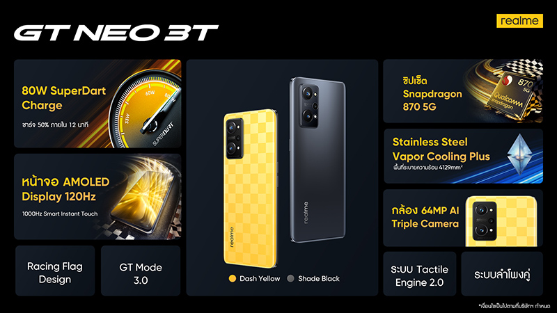 realme GT NEO 3T มาพร้อมความจุ 8+128GB มีให้เลือก 2 สี ได้แก่ Dash Yellow และ Shade Black
