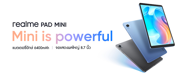 - realme Pad Mini รุ่น 3+32 LTE ราคา 5,999 บาท ในช่องทาง realme Brand Shop ตั้งแต่วันที่ 11 มิถุนายนเป็นต้นไป รับฟรี! realme Buds 2 Neo (จำนวนจำกัด)