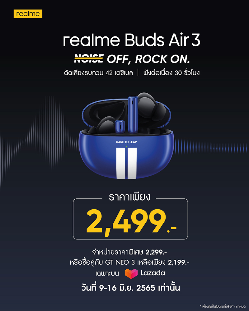 realme Buds Air 3 มาพร้อมโทนสีใหม่ล่าสุด Nitro Blue ราคาปกติ 2,499 บาท โปรโมชั่นพิเศษ เหลือเพียง 2,299 บาท หรือซื้อในราคา 2,199 บาท เมื่อซื้อคู่กับ realme GT NEO 3 ระหว่างวันที่ 9-16 มิถุนายนนี้ ในช่องทาง Lazada
