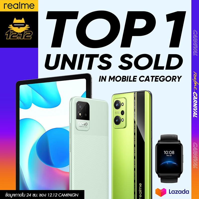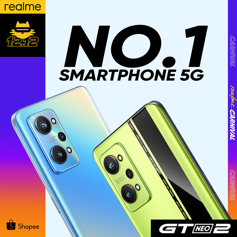 realme สุดปลื้ม realme GT Neo2 5G กวาดยอดขายสูงสุดในหมวดสมาร์ตโฟน 5G บน Shopee กับแคมเปญ 12.12 realme Carnival ตอกย้ำความสำเร็จแบรนด์สมาร์ตโฟน 5G ระดับไฮเอนด์ในไทย