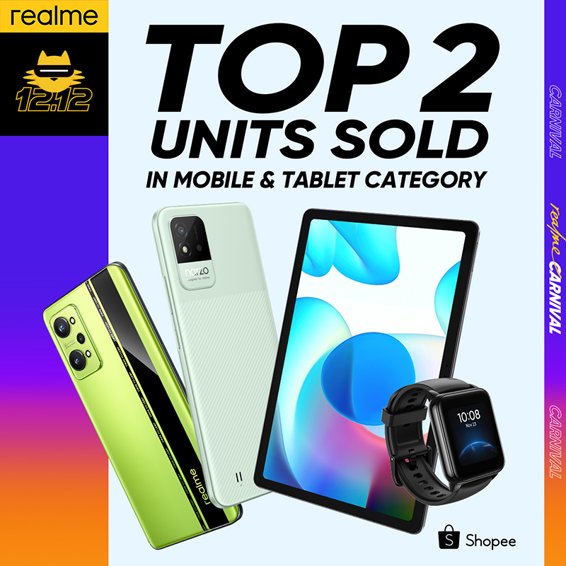 realme แบรนด์สมาร์ตโฟนเพื่อคนรุ่นใหม่ที่เติบโตเร็วที่สุดในโลก ฉลองความสำเร็จส่งท้ายปี ทำยอดขายกระหน่ำจากโปรโมชั่น 12.12 realme Carnival มหกรรมลดกระหน่ำยิ่งใหญ่ส่งท้ายปี บนแพลตฟอร์มออนไลน์ได้อย่างถล่มทลายเหนือความคาดหมายในทุกกลุ่มสินค้า เรียกได้ว่าปังสุด ๆ ! เริ่มจากในช่องทาง Shopee สามารถครองตำแหน่งแบรนด์ขายดีอันดับ 1 ในกลุ่มสินค้า Smartphone 5G ได้สำเร็จ โดยสมาร์ตโฟน 5G ที่ขายดีที่สุดจากทุกแบรนด์ คือ realme GT Neo2 5G” ที่มาพร้อมกับซิปเซ็ตทรงพลัง Snapdragon  870 5G มอบประสิทธิภาพการทำงานขั้นสุด ลื่นไหลไม่มีสะดุดทุกฟีเจอร์ รองรับเกมกราฟิกหนัก ๆ ได้แบบสบาย ๆ พร้อมจอแสดงผล E4 AMOLED และรองรับระบบ SuperDart Charge 65W  และยังมอบดีไซน์หรูหราที่จะสะกดทุกสายตาด้วยโทนสีเขียวสดใส Neo Green