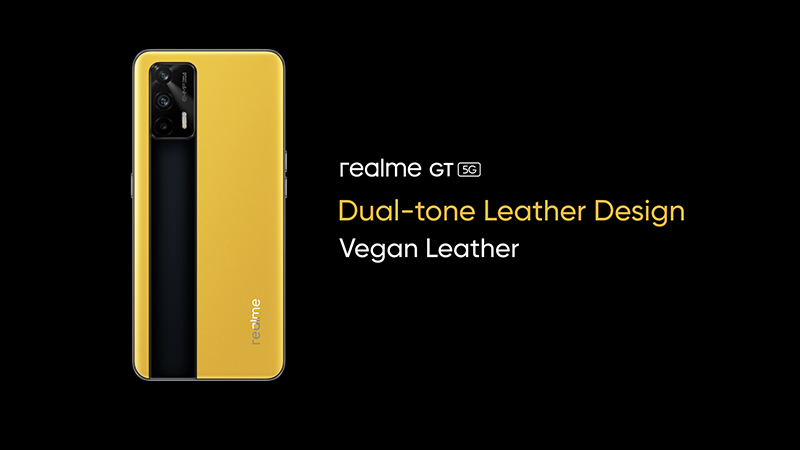 realme GT มีการออกแบบที่เป็นเอกลักษณ์และไม่เหมือนใคร ด้วยการออกโดยใช้หนังวีแกนแบบ Dual-tone ใช้วัสดุ 2 ชนิดที่แตกต่างกัน และใช้ 2 สีที่แตกต่างกัน ให้ความรู้สึกถึงความเร็วแรงดั่งประสิทธิภาพการทำงานระดับสูง realme ยังริเริ่มใช้กระบวนการขึ้นรูปชิ้นเดียวสำหรับฝาหลังและกรอบด้านในทำให้หนังวีแกนกระชับยิ่งขึ้น และตัดด้วยสีดำที่มีความมันวาวให้ความรู้สึกถึง “แทร็คในสนามแข่ง” ในขณะเดียวกัน realme อัพเกรดขั้นตอนการผลิตหนังวีแกนเป็นรุ่นที่ 2 ซึ่งจะมีความละเอียดอ่อน ให้สัมผัสที่นุ่มนวลมากยิ่งขึ้น และเอฟเฟกต์ของสีที่ชัดขึ้น
