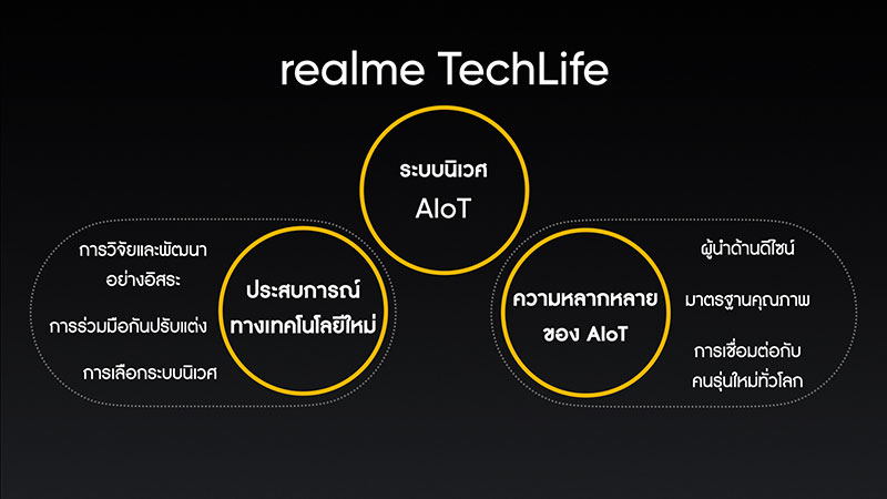 เพื่อตอกย้ำความเป็นแบรนด์สมาร์ทโฟนเพื่อคนรุ่นใหม่ realme มุ่งมั่นที่จะพัฒนาระบบนิเวศ AIoT เพื่อตอบโจทย์ทุกความต้องการของคนรุ่นใหม่อยู่เสมอ โดยได้สร้างแฟลตฟอร์มระบบนิเวศ realme Techlife เพื่อค้นหาพาร์ทเนอร์ที่มีนวัตกรรมล้ำสมัยทั่วโลกเพื่อสร้างผลิตภัณฑ์ที่มีประสบการณ์ทางเทคโนโลยีใหม่สำหรับผู้ใช้ทั่วโลก ภายใต้ 3 ความสอดคล้อง ได้แก่ ดีไซน์ มาตรฐานคุณภาพและเครือข่ายการเชื่อมต่อ