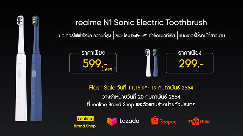 realme N1 Sonic Electric Toothbrush แปรงสีฟันไฟฟ้าโซนิค ที่มาพร้อมมอเตอร์ไฟฟ้าโซนิค ความถี่สูง 20,000 ครั้ง/นาที พร้อมขนแปรง Dupont™ ช่วยกำจัดแบคทีเรีย 99.99% และแบตเตอรี่ใช้งานได้ยาวนาน 130 วัน มาในราคาเพียง 699 บาท มาพร้อมหัวแปรงที่สามารถเปลี่ยนได้ ในราคาเพียง 299 บาท พิเศษ! ในวันที่ 11 16 และ 19 กุมภาพันธ์ พบกับ realme N1 Sonic Electric Toothbrush ในราคา Flash Sale พิเศษเพียง 599 บาท ผ่าน realme Official Store ทาง Lazada, Shopee และ Thisshop เท่านั้น พร้อมวางจำหน่ายพร้อมกันในวันที่ 20 กุมภาพันธ์นี้ ที่ realme Brand Shop และตัวแทนจำหน่ายทั่วประเทศ