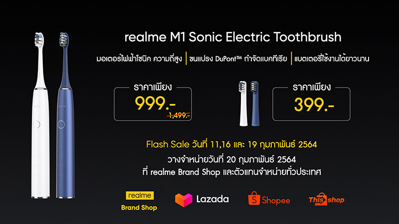 realme M1 Sonic Electric Toothbrush แปรงสีฟันไฟฟ้าโซนิค ที่มาพร้อมมอเตอร์ไฟฟ้าโซนิค ความถี่สูง 34,000 ครั้ง/ นาที พร้อมขนแปรง Dupont™ ช่วยกำจัดแบคทีเรีย 99.99% และแบตเตอรี่ใช้งานได้ยาวนาน 90 วัน มาในราคาเพียง 1,499 บาท มาพร้อมหัวแปรงที่สามารถเปลี่ยนได้ ในราคาเพียง 399 บาท พิเศษ! ในวันที่ 11 16 และ 19 กุมภาพันธ์ พบกับ realme M1 Sonic Electric Toothbrush ในราคา Flash Sale พิเศษเพียง 999 บาท ผ่าน realme Official Store ทาง Lazada, Shopee และ Thisshop เท่านั้น พร้อมวางจำหน่ายพร้อมกันในวันที่ 20 กุมภาพันธ์นี้ ที่ realme Brand Shop และตัวแทนจำหน่ายทั่วประเทศ