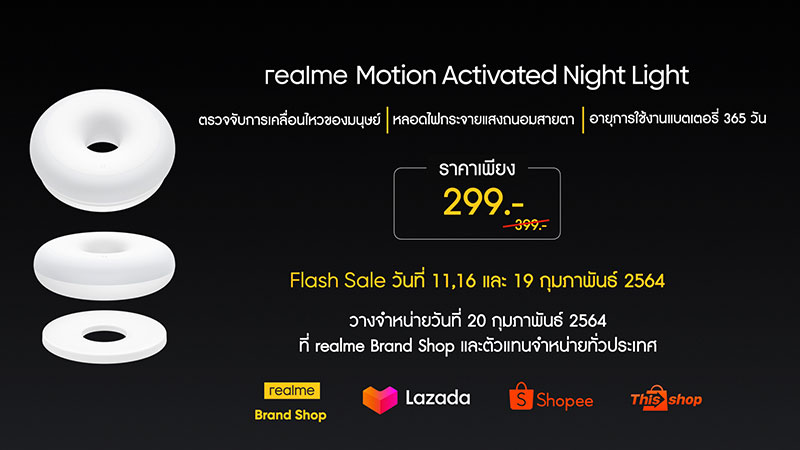 realme Motion Activated Night Light ที่มาพร้อมการตรวจจับการเคลื่อนไหวของมนุษย์ แสงหลอดไฟกระจายแสงถนอมสายตา แบตเตอรี่ยาวนาน 365 วัน มาในราคาเพียง 399 บาท พิเศษ! ในวันที่ 11, 16 และ 19 กุมภาพันธ์ พบกับ Flash Sale ราคาพิเศษเพียง 299 บาท ผ่าน realme Official Store ทาง Lazada, Shopee และ Thisshop เท่านั้น พร้อมวางจำหน่ายพร้อมกันในวันที่ 20 กุมภาพันธ์นี้ ที่ realme Brand Shop และตัวแทนจำหน่ายทั่วประเทศ