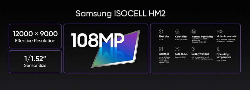 realme 8 Pro มาพร้อมเลนส์หลักเซ็นเซอร์ใหม่ล่าสุดอย่าง Samsung ISOCELL HM2 ความละเอียด 108 ล้านพิกเซล กับเซ็นเซอร์ขนาดใหญ่ 1/1.52″ ความละเอียด 12,000 x 9,000 พิกเซล ด้วยขนาดพิกเซลที่ใหญ่ขึ้นทำให้ได้คุณภาพของภาพที่ดียิ่งขึ้น นอกจากนี้เซ็นเซอร์ HM2 ยังรองรับเทคโนโลยี 9-in-1 Pixel Binning, ISOCELL Plus และ Smart-ISO ซึ่งทำช่วยให้ realme 8 Pro สามารถถ่ายภาพได้อย่างคมชัดในสภาวะแสงต่าง ๆ มากขึ้น