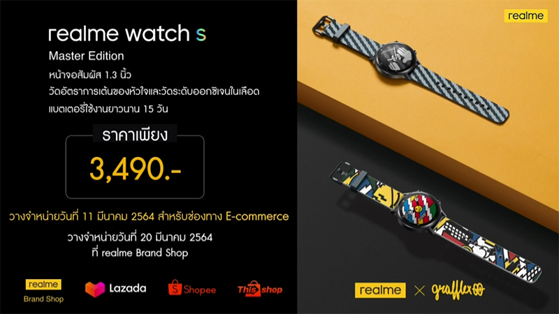เป็นเจ้าของงานศิลปะจากดีไซนเนอร์ชื่อดัง GRAFFLEX สำหรับ realme Watch S Master Edition หน้าจอสัมผัส 1.3 นิ้ว สามารถวัดการเต้นของหัวใจและวัดระดับออกซิเจนในเลือด พร้อมแบตเตอรี่ใช้งานยาวนาน 15 วัน มาในราคาเพียง 3,490 บาท ผ่านช่องทาง E-Commerce ในวันที่ 11 มีนาคม 2564 เท่านั้น และสามารถเป็นเจ้าของได้พร้อมกันในวันที่ 20 มีนาคม 2564 ที่ realme Brand Shop