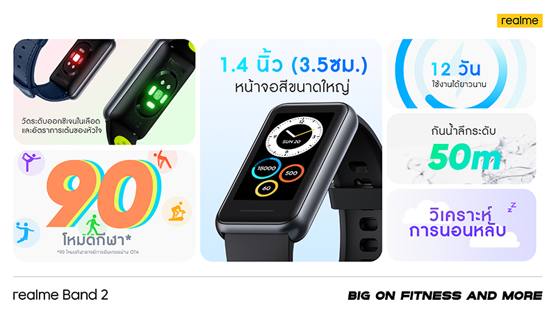 สำหรับสายสปอร์ต realme Band 2 มีโหมดการออกกำลังกายและการเล่นกีฬามากถึง 90 โหมด ไม่ว่าจะเป็นการวิ่ง ปั่นจักรยาน การฝึกเทรนนิ่งเพิ่มความแข็งแรง ว่ายน้ำ และอื่นๆ พร้อมระบบบันทึกข้อมูลการออกกำลังกาย แคลอรี่ที่บริโภค และแคลอรี่ที่เผาผลาญไปทั้งหมด ทั้งแบบรายวันและรายสัปดาห์ นอกจากนี้ realme Band 2 ได้เพิ่มระดับการป้องกันการซึมผ่านของน้ำจาก IP68 เป็น 5ATM จึงกันน้ำลึกระดับ 50 เมตร