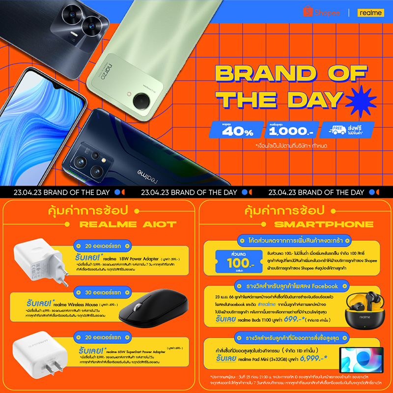 realme (เรียลมี) แบรนด์สมาร์ตโฟนเพื่อคนรุ่นใหม่ที่เติบโตเร็วที่สุดในโลก ประกาศความสำเร็จต่อเนื่องไม่หยุด ล่าสุด ทำยอดขายติดอันดับ Top2 (GMV) ในช่องทาง Shopee 2 เดือนติดต่อกันทั้งกุมภาพันธ์และมีนาคม 2566 ในหมวดโทรศัพท์มือถือและแท็บเล็ต และเพื่อตอกย้ำความเป็นสมาร์ตโฟนประสิทธิภาพสูงในราคาสุดคุ้มที่ครองใจมหาชนคนรุ่นใหม่อย่างแท้จริง realme อัดโปรโมชันเอาใจแฟน ๆ อีกครั้งทาง Shopee กับเทศกาล Brand Of The Day ตั้งแต่วันที่ 21 เมษายน – 23 เมษายน ด้วยของสมนาคุณสุดพรีเมียม ตามเงื่อนไขดังนี้
