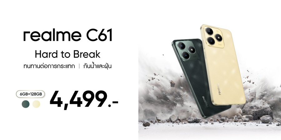 realme เปิดตัว realme C61 สมาร์ตโฟนรุ่นล่าสุดจากตระกูล C-series เจ้าของฉายา “Hard to Break” พันธุ์แกร่งแห่งเซกเมนต์ เปิดมาตรฐานใหม่ของสมาร์ตโฟนระดับ Entry-level ด้วยความแข็งแกร่งที่เหนือชั้นด้วยคุณสมบัติกันน้ำกันฝุ่น IP54 ซึ่งดีที่สุดในคลาส มาพร้อมแบตเตอรี่ขนาดยักษ์คุณภาพสูงที่มีอายุการใช้งานยาวนานกว่า 4 ปี ซึ่งถือเป็นมาตรฐานของแบตเตอรี่ที่ดีที่สุดในกลุ่ม