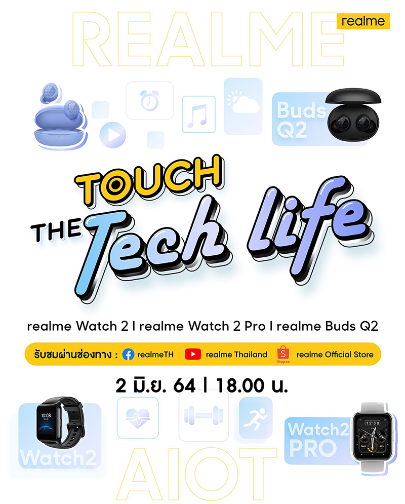 realme แบรนด์สมาร์ทโฟนเพื่อคนรุ่นใหม่ที่เติบโตเร็วที่สุดในโลก ชวนคุณร่วมเปิดประสบการณ์สุดล้ำกับผลิตภัณฑ์ AIoT รุ่นใหม่ล่าสุดจาก realme ในงาน Touch The Tech Life งานเปิดตัวสมาร์ทวอทช์ ที่ตอบโจทย์สำหรับคนรุ่นใหม่ในยุคปัจจุบัน ซึ่งมาพร้อมกับดีไซน์สุดหรู นับเป็นหนึ่งในสมาร์ทวอทช์ที่ดีที่สุดและคุ้มค่าที่สุดสำหรับ Android กับ realme Watch 2 และ realme Watch 2 Pro สมาร์ทวอทช์อัจฉริยะได้รับมาตรฐานด้านคุณภาพชั้นเยี่ยมพร้อมฟังก์ชั่นหลากหลาย ที่จะพาคุณไปสู่โลกที่เหนือระดับ นอกจากนี้ ยังมาพร้อมกับ realme Buds Q2 หูฟังไร้สายซึ่งได้รับแรงบันดาลใจยอดเยี่ยมและอัดแน่นไปด้วยระบบควบคุมอัจฉริยะ