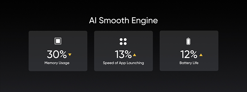 realme UI 3.0 ได้มีการนำเสนอ AI เพื่อการทำงานที่ราบรื่นในทุกฟีเจอร์และช่วยลดการใช้พลังงานแบตเตอรี่ตั้งแต่ระดับพื้นฐาน รวมถึงอัตราการใช้งานหน่วยความจำก็ถูกยกระดับประสิทธิภาพ ลดช่องว่างการบันทึกข้อมูลในหน่วยความจำ และ AI ยังช่วยบีบอัดหน่วยความจำเพื่อให้สามารถเปิดโปรแกรมการทำงานที่แตกต่างกันได้อย่างราบรื่น รวมถึงการจัดลำดับการใช้ทรัพยากรอย่างเหมาะสม ปัจจัยเหล่านี้ช่วยลดการใช้หน่วยความจำเครื่องได้ถึง 30% เพิ่มประสิทธิภาพการเปิดแอปพลิเคชันในภาพรวมได้ถึง 13% และเพิ่มอายุแบตเตอรี่ได้ถึง 12%