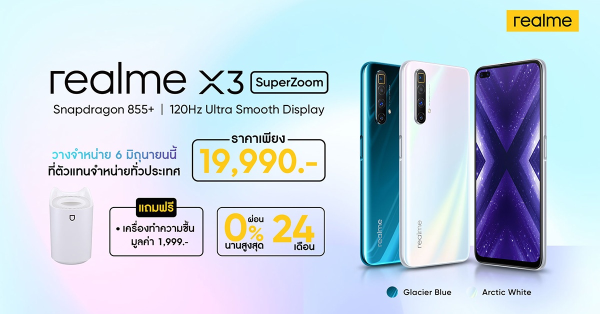 realme แบรนด์สมาร์ทโฟนเพื่อคนรุ่นใหม่ที่เติบโตเร็วที่สุดในโลก หลังจากประสบความสำเร็จกับสมาร์ทโฟนเรือธงรุ่นแรกอย่าง realme X2 Pro เมื่อเร็วๆ นี้ realme ได้มีการเปิดตัวสมาร์ทโฟนพลังแรงรุ่นใหม่อย่าง realme X3 SuperZoom สมาร์ทโฟนเรือธงรุ่นแรกที่มาพร้อมเลนส์ Periscope พลังซูม 60 เท่า มีการอัพเกรดด้วยประสิทธิภาพการประมวลผลเร็วแรงทรงพลังด้วยชิปเซ็ต Snapdragon 855+ และหน้าจอลื่นไหลด้วยอัตรา Refresh Rate 120Hz ล่าสุด realme เตรียมวางจำหน่าย realme X3 SuperZoom ในราคาเพียง 19,990 บาท พร้อมโปรโมชั่นผ่อน 0% นานสูงสุด 24 เดือน พิเศษ! รับฟรีเครื่องทำความชื้นมูลค่า 1,999 บาท วางจำหน่ายพร้อมกันในวันที่ 6 มิถุนายนนี้ ทาง realme Brand Shop และตัวแทนจำหน่ายทั่วประเทศ