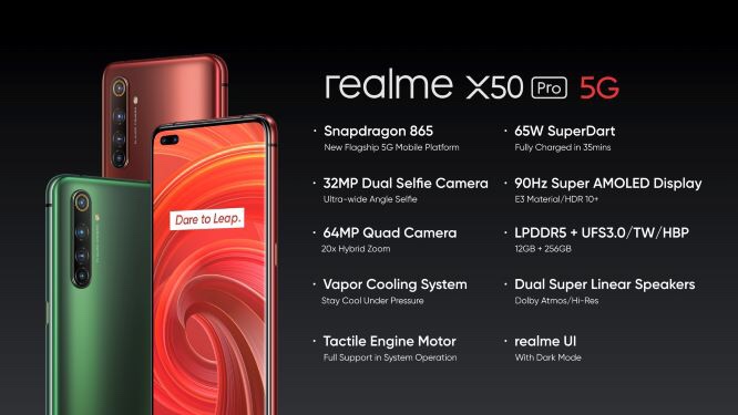 ในฐานะผู้นำที่เหนือกว่าในยุค 5G ล่าสุด realme ได้เปิดตัว realme X50 Pro 5G สมาร์ทโฟนเรือธงรุ่นแรกที่รองรับ 5G ตัวเครื่องมาพร้อมวัสดุโลหะและโทนสีแบบ Low-saturation มาพร้อมกัน 2 สีที่กำลังเป็นที่นิยมอย่าง Moss Green และ Rust Red สำหรับหน้าจอและฝาหลังมาพร้อมกระจกกันรอย 3D Corning Gorilla Glass 5 และการป้องกันพื้นผิวกระจกแบบ AG ด้วยวัสดุที่มีคุณภาพจึงทำให้ผู้ใช้งานมั่นใจในความทนทานและตัวเครื่องที่จับถือสะดวกกระชับมือ นอกจากนี้ realme X50 Pro 5G ยังมาพร้อมขุมพลังหน่วยประมวลผล Qualcomm Snapdragon 865 รองรับ 5G พร้อมแรม LPDDRS5 และ UFS 3.0 ช่วยให้ประสิทธิภาพการทำงานเร็วแรงไหลลื่นมากยิ่งขึ้น