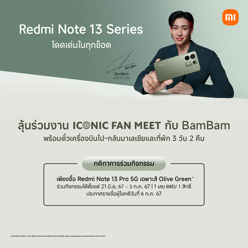 ลูกค้าที่ซื้อสมาร์ทโฟน Redmi Note 13 Pro 5G สี Olive Green ผ่านร้านค้าที่ร่วมรายการและลงทะเบียนร่วมกิจกรรมผ่านเว็บไซต์ www.mi.com/th/event/2024/iconic-fan-meet ในระหว่างวันที่ 21 มิถุนายน – 3 กรกฎาคม 2567 ร่วมลุ้นเป็นหนึ่งใน 50 ผู้โชคดี เพื่อเข้าร่วมงาน ‘ICONIC FAN MEET กับ BamBam’ ในวันเสาร์ที่ 13 กรกฎาคม 2567 ที่ประเทศมาเลเซีย พร้อมรับตั๋วเครื่องบินไป-กลับ กรุงเทพฯ – กัวลาลัมเปอร์ และที่พักจำนวน 2 คืน มูลค่ารางวัลละ 15,000 บาท (1 ผู้โชคดี ต่อ 1 รางวัล) โดยจะประกาศรายชื่อผู้โชคดีที่ได้รับรางวัล จำนวน 50 ท่านบน Facebook Page Xiaomi Thailand ในวันที่ 6 กรกฎาคม 2567 เป็นต้นไป*