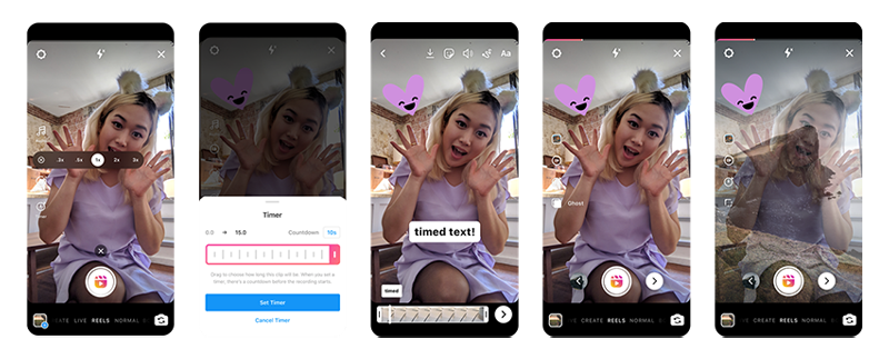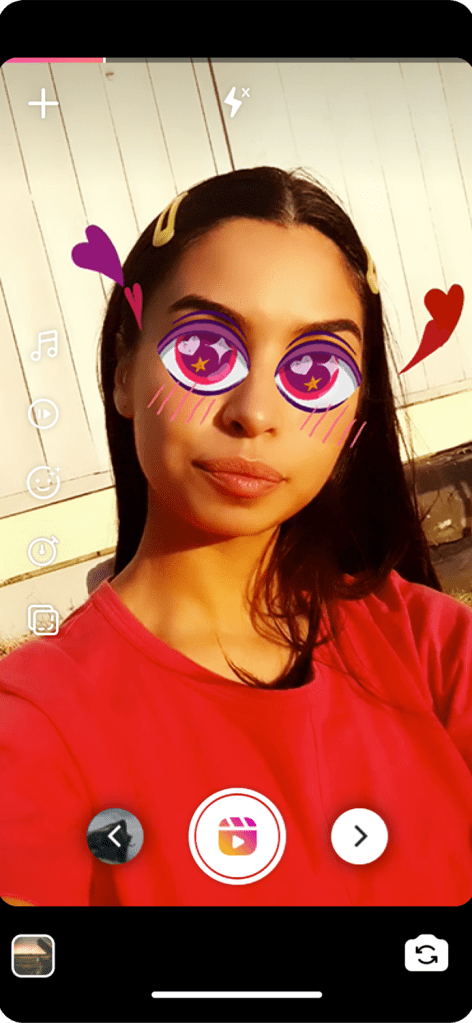 - เอ็ฟเฟ็กต์: ถ่ายคลิปด้วยเอ็ฟเฟ็กต์ Instagram ใดๆ ก็ได้ ซึ่งรวมถึงฟิลเตอร์ AR โดยสามารถถ่ายคลิปหลายๆ คลิปด้วยเอ็ฟเฟ็กต์ที่แตกต่างกัน และสามารถใช้เอ็ฟเฟ็กต์ที่สร้างสรรค์ขึ้นมาโดยผู้ใช้งานคนอื่นทั่วโลกได้