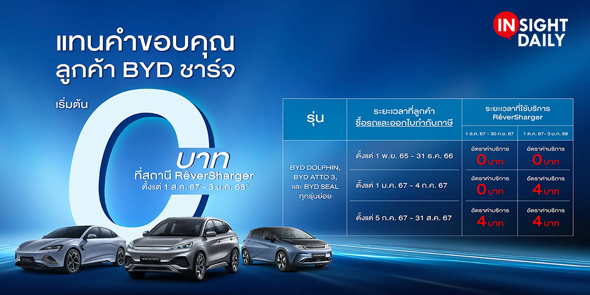 เรเว่ ออโตโมทีฟ มอบสิทธิพิเศษแทนคำขอบคุณลูกค้า BYD ชาร์จฟรี! ที่ RÊVERSHARGER นานสูงสุดถึง 3 มกราคม 2568