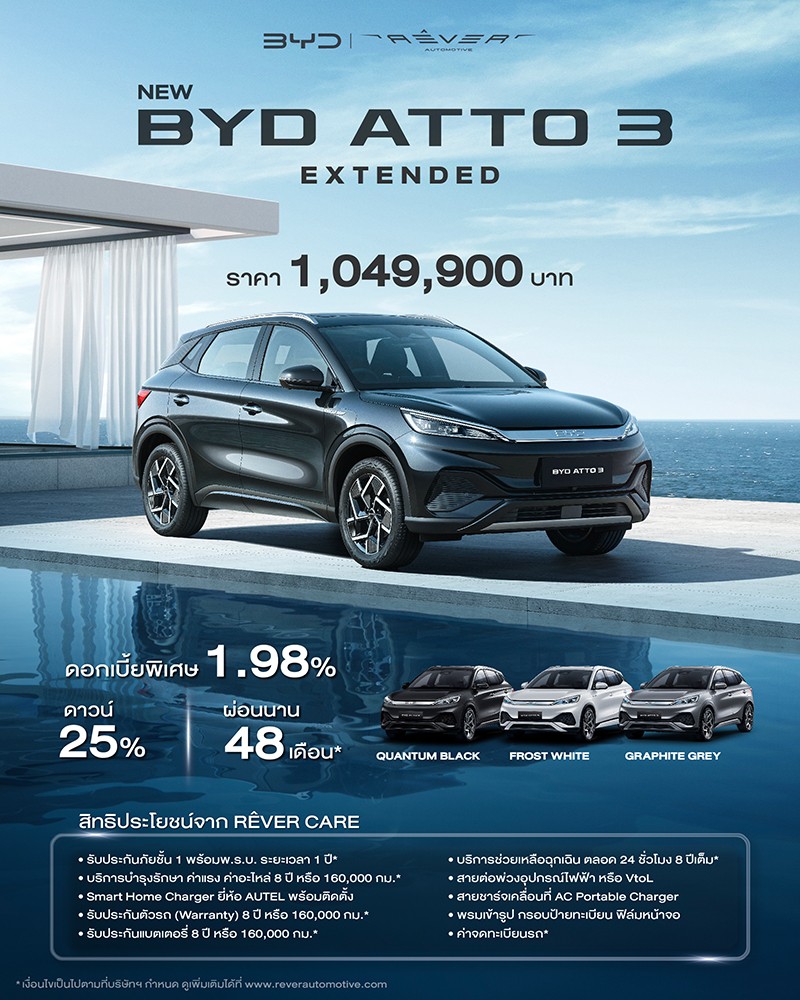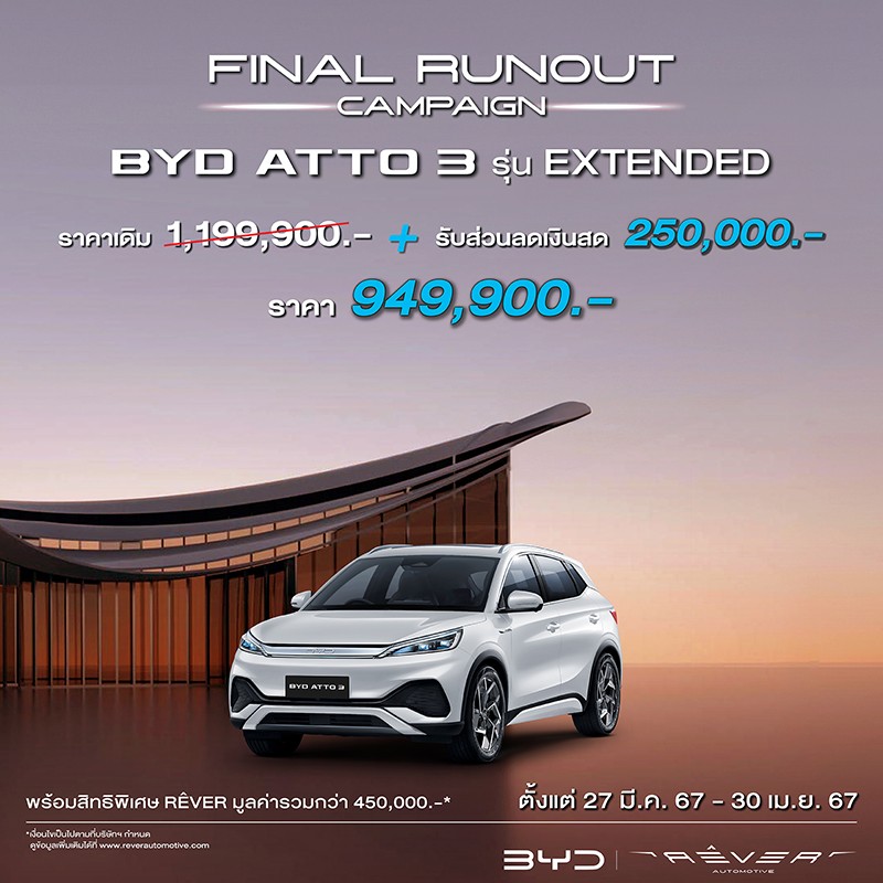 - ลูกค้าที่ซื้อ BYD ATTO 3 Extended รุ่นปี 2023 รับส่วนลดเงินสด 250,000 บาท เหลือเพียง 949,900 บาท (จากราคาปกติ 1,199,900 บาท) พร้อมสิทธิพิเศษ RÊVER มูลค่ารวมกว่า 450,000 บาท