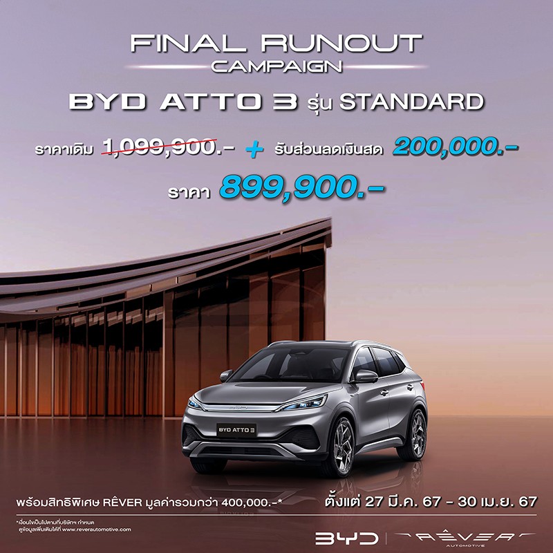 - ลูกค้าที่ซื้อ BYD ATTO 3 Standard รุ่นปี 2023 รับส่วนลดเงินสด 200,000 บาท เหลือเพียง 899,900 บาท (จากราคาปกติ 1,099,900 บาท) พร้อมสิทธิพิเศษ RÊVER มูลค่ารวมกว่า 400,000 บาท